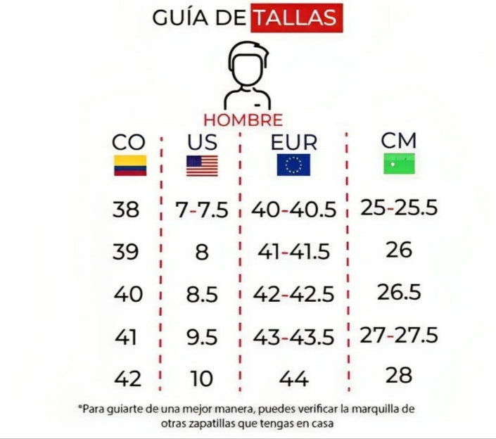 HolaSomos una empresa multi comercio distribuidor directo de fabrica y bodega de artículos de excelente calidad en calzado y ropa, y contamos con la responsabilidad y compromiso que se requiere para trabajar en la plataforma.La garantía en calzado es de fabricación en costura y pegado. En calidad 1.1 y triple AAA importándolas tallas son Europeas ( Eur)Te sugerimos hacer una adecuada medida de el pie en Colocando el pie apoyado en la pared y guiarse por la tabla de tallas y medidas o por otro tenis que uses con la medida indicada en las zapatillas.No tiene variables porqué antes de hacer todo pedido desde la plataforma queremos tener una buena comunicación que permita hacer las confirmaciones necesarias y desde Whatsapp , con captura poder brindar una adecuada asesoria a cerca de tallas y diseños previa a la compra Luego se solicita el pedido desde la plataforma especificando bien en las notas la talla y el color o diseño de su elección si desea desde el mismo WhatsApp para así asegurar un adecuado servicio. Colores y diseños en foto.WhatsApp Envíos por Servientrega, interrapidisimo, coordinadora o envío.